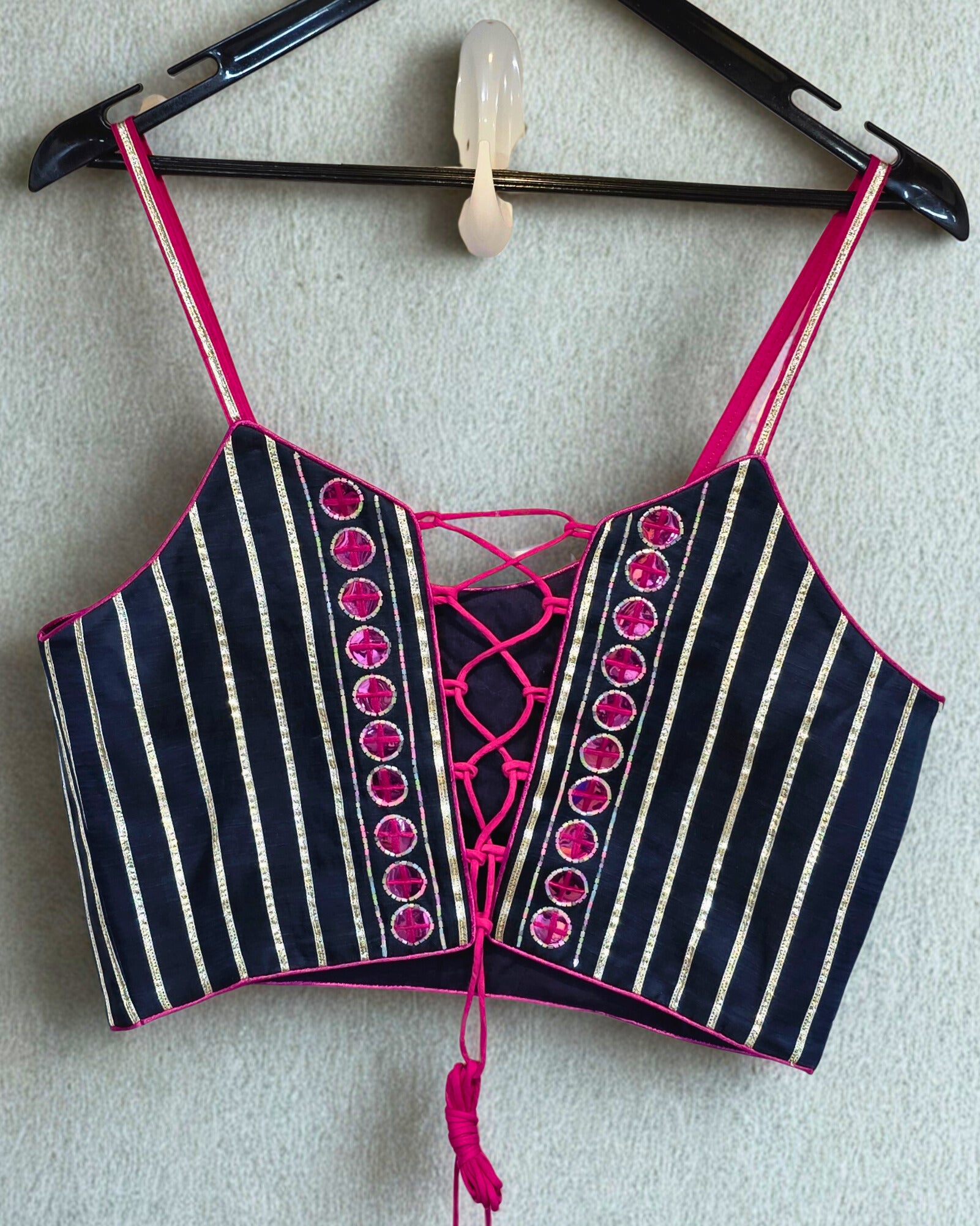 This blackish blue blouse is exquisitely adorned with intricate handwork throughout, showcasing craftsmanship that elevates any traditional outfit. The rich color combined with detailed embellishments provides a sophisticated and elegant look, perfect for special occasions or festive events. Its artisanal finish ensures a unique appeal while maintaining comfort and style.