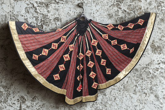 Experience the elegance of this Black and Kalamkari Print Kali Ghagra, designed with 12 meters of graceful flair for a stunning silhouette. Featuring a sophisticated combination of deep black and vibrant kalamkari red fabric, it is...Sale price ₹ 7,999.00Regular price ₹ 8,999.00 -