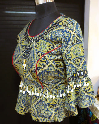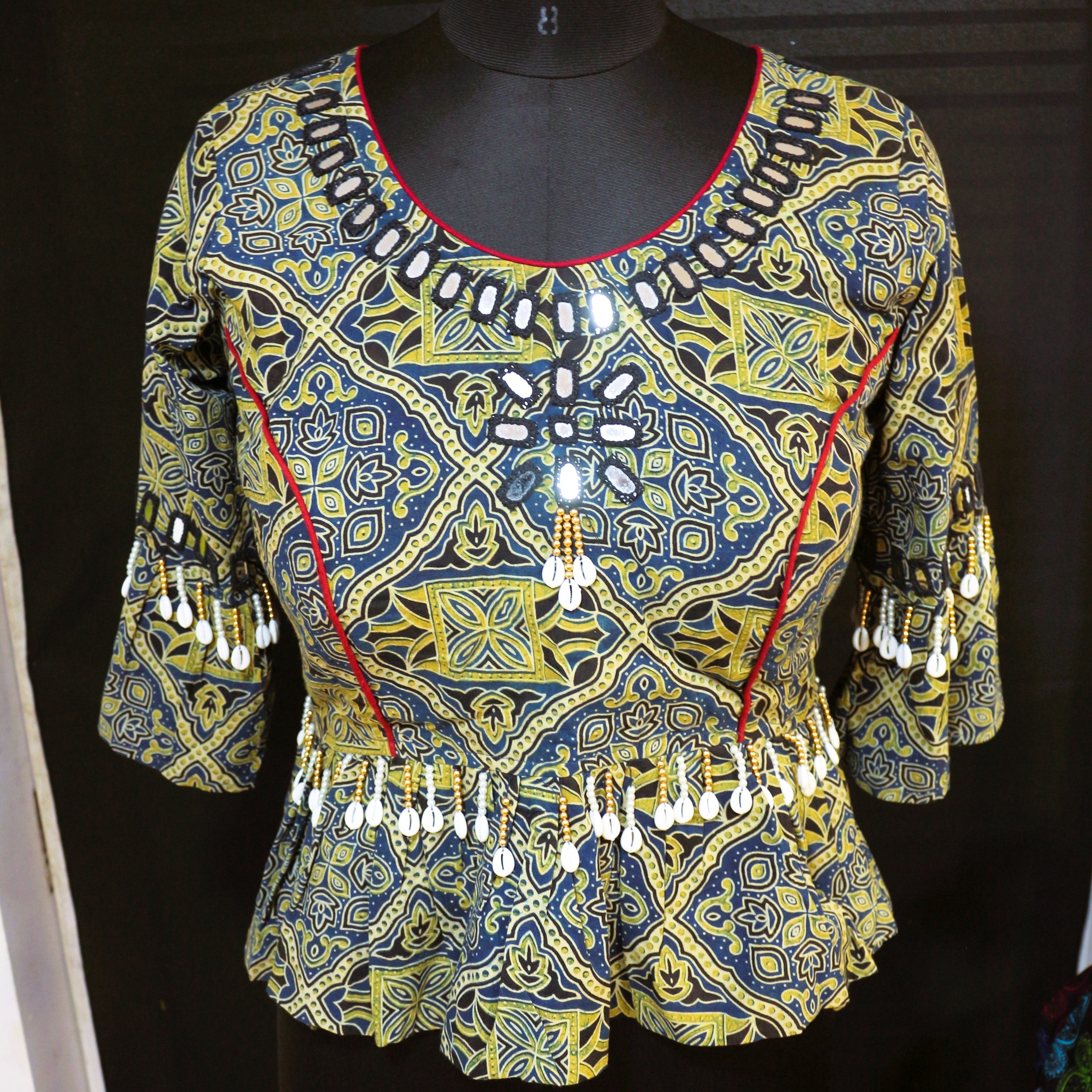 Elevate your ethnic wardrobe with this expertly crafted peplum blouse featuring intricate mirror work. The tailored silhouette enhances your figure while the reflective embellishments add a sophisticated shimmer, perfect for festive occasions or traditional events. Designed for a flawless fit, this blouse combines classic style with artisanal detailing, ensuring you stand out with grace and elegance.