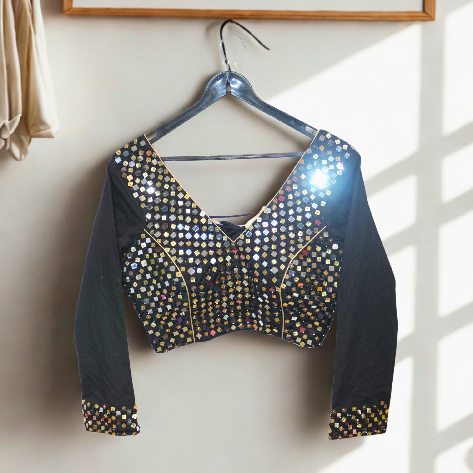 Crafted from pure cotton, this elegant black garment features full sleeves and intricate mirror work combined with detailed hand embroidery. The black and gold color palette adds a timeless sophistication, making it perfect for both formal occasions and stylish everyday wear. Its breathable fabric ensures comfort, while the artisan craftsmanship highlights cultural finesse and refined design.
