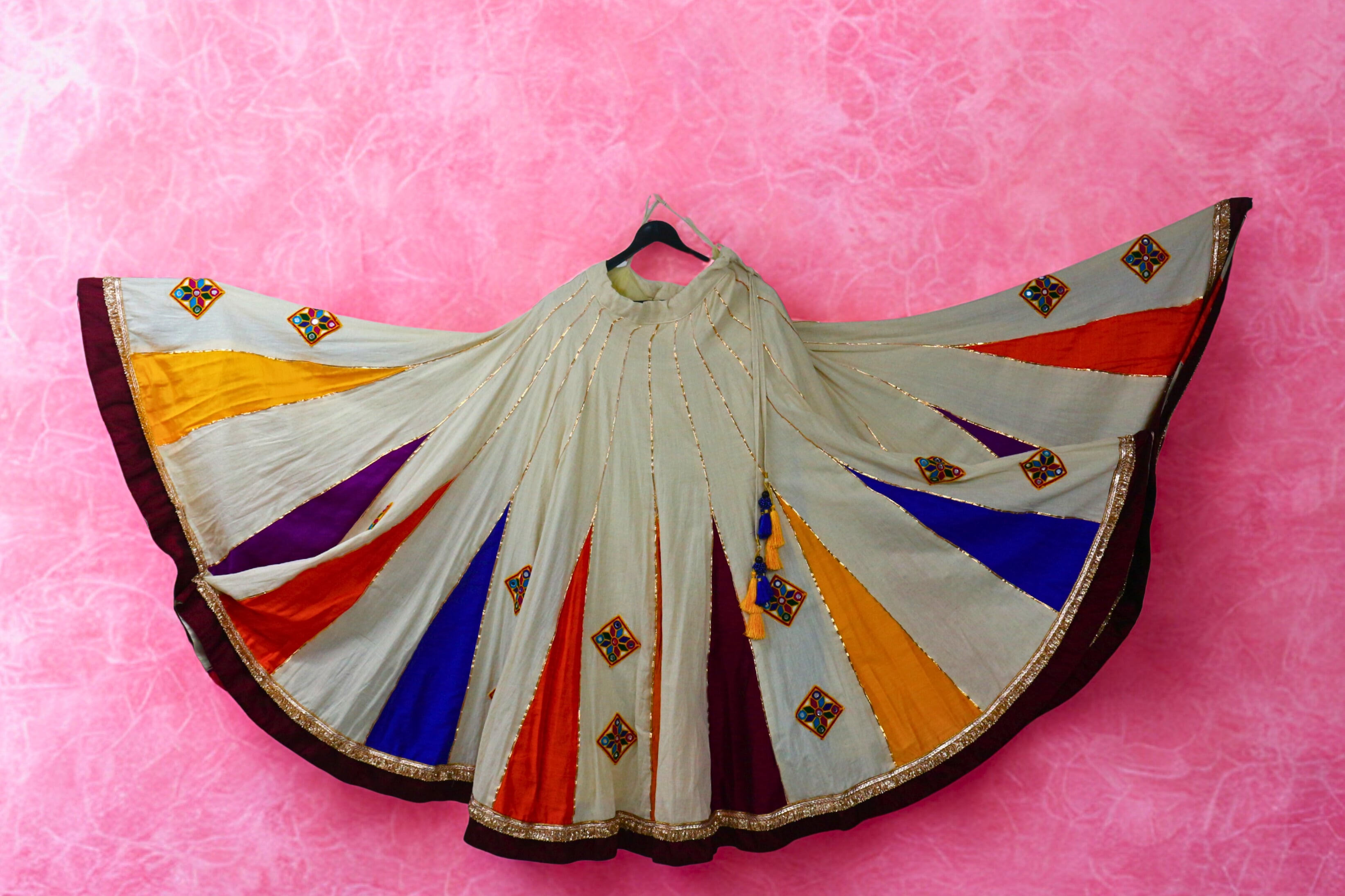 Crafted from pure white soft cotton, this 12-meter flared ghagra showcases intricate handwork and delicate lace detailing. Adorned with colorful small kalis throughout, it offers a vibrant yet traditional aesthetic. Ideal for ethnic occasions, this garment combines comfort with artisanal elegance, ensuring a striking and graceful presence.