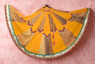 This vibrant yellow ghagra features uniquely designed diamond-cut kalis printed on premium fabric, enhanced with delicate hand and lace work. Combining tradition with intricate craftsmanship, it creates a distinctive ethnic appeal perfect for all occasions. Its detailed finish adds elegance and grace, making it a versatile choice for festive celebrations and cultural events.