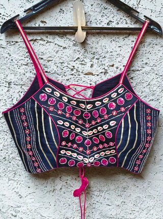 This blackish blue blouse is exquisitely adorned with intricate handwork throughout, showcasing craftsmanship that elevates any traditional outfit. The rich color combined with detailed embellishments provides a sophisticated and elegant look, perfect for special occasions or festive events. Its artisanal finish ensures a unique appeal while maintaining comfort and style.