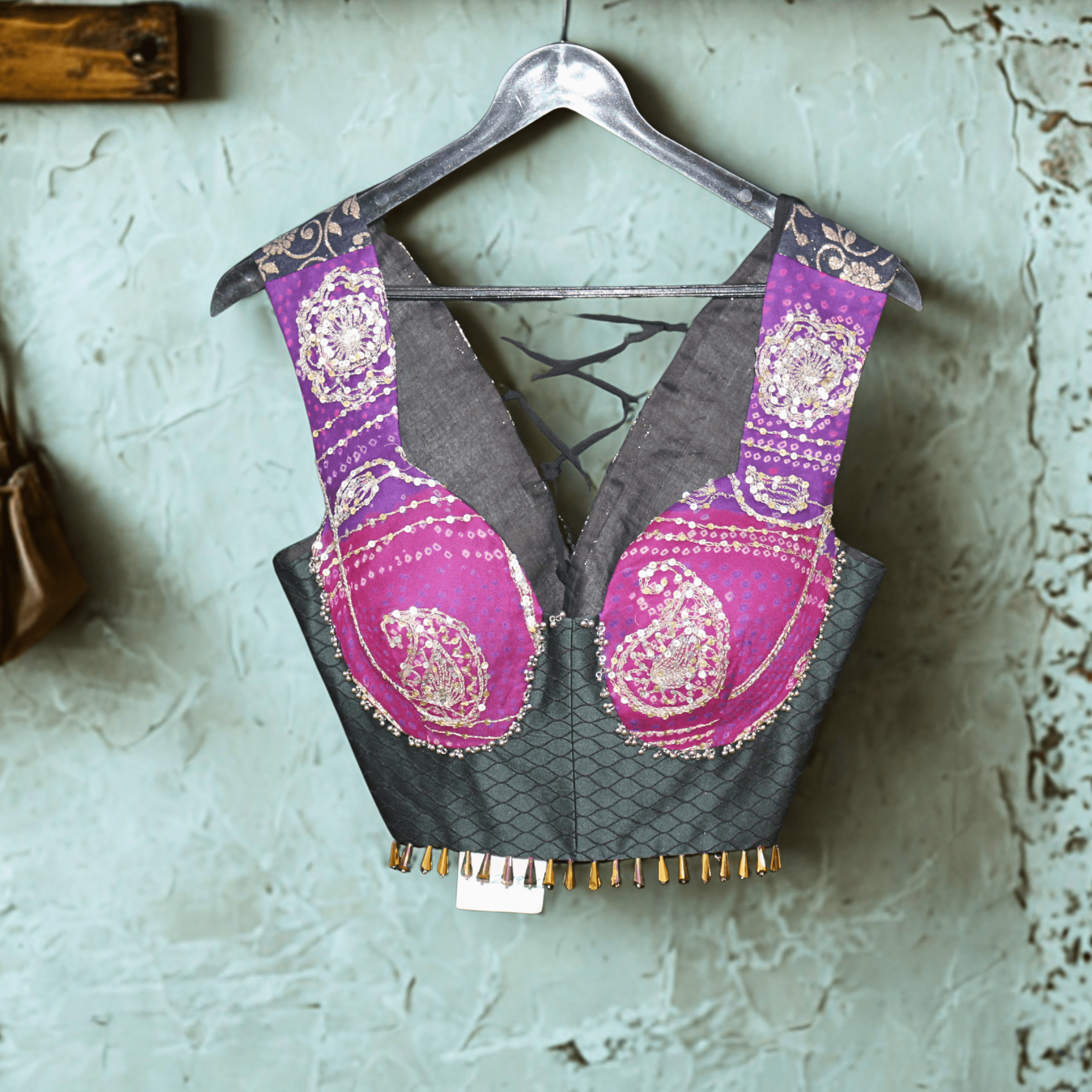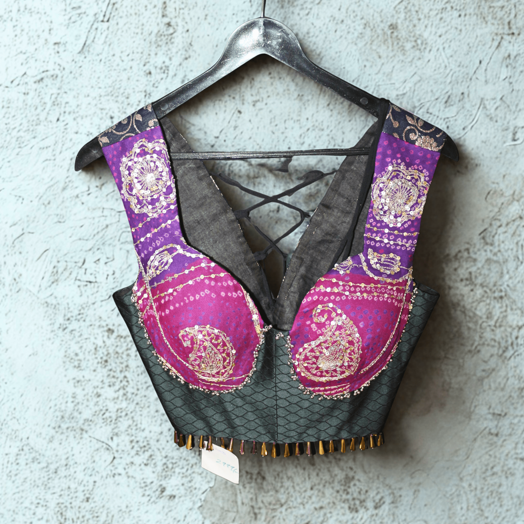 This sleeveless blouse features a unique blend of pink and purple fabrics enhanced with intricate handwork for an exclusive, artisanal appeal. Designed with a free-size fit, it includes soft padding for added comfort and shape, making it a versatile addition to your wardrobe that combines elegance with ease.